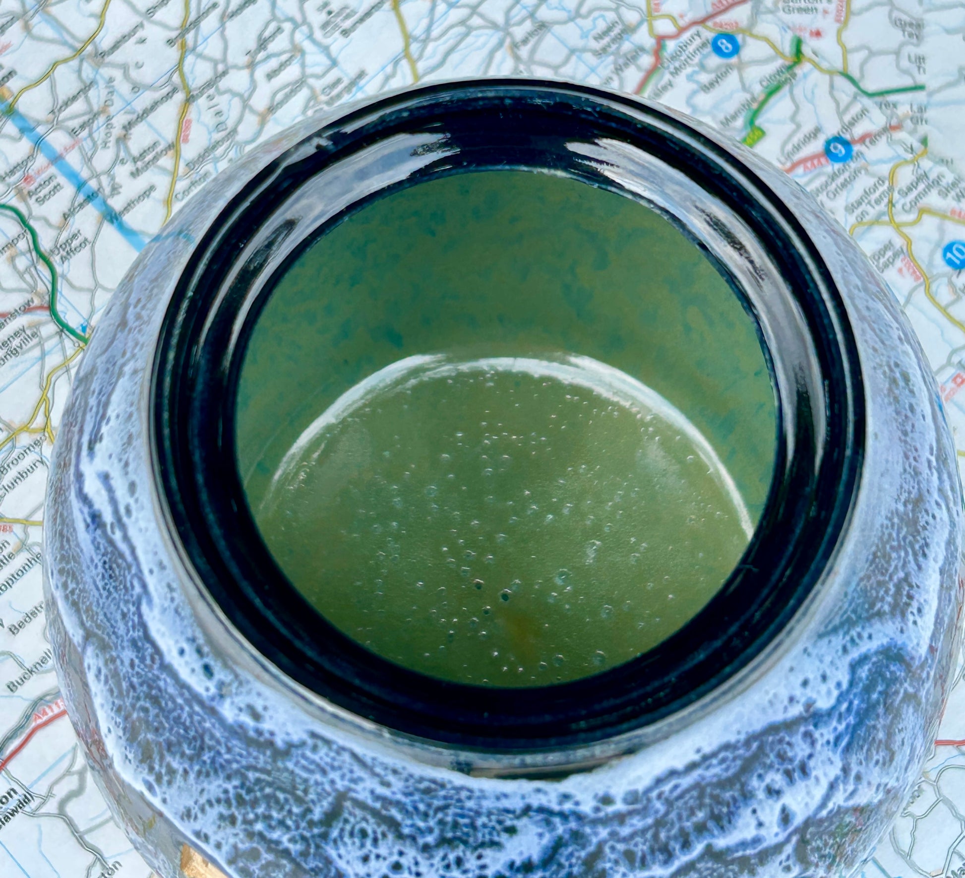 Green inside, the outer glaze is a stunning frosted black and dark blue.