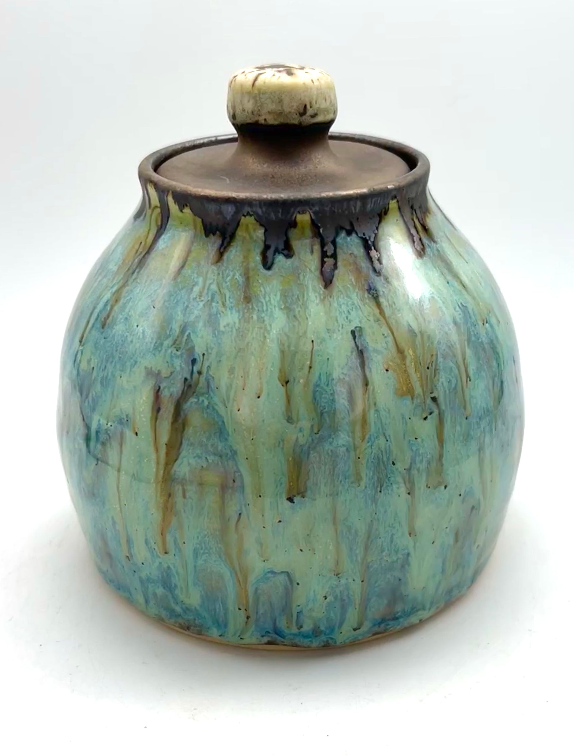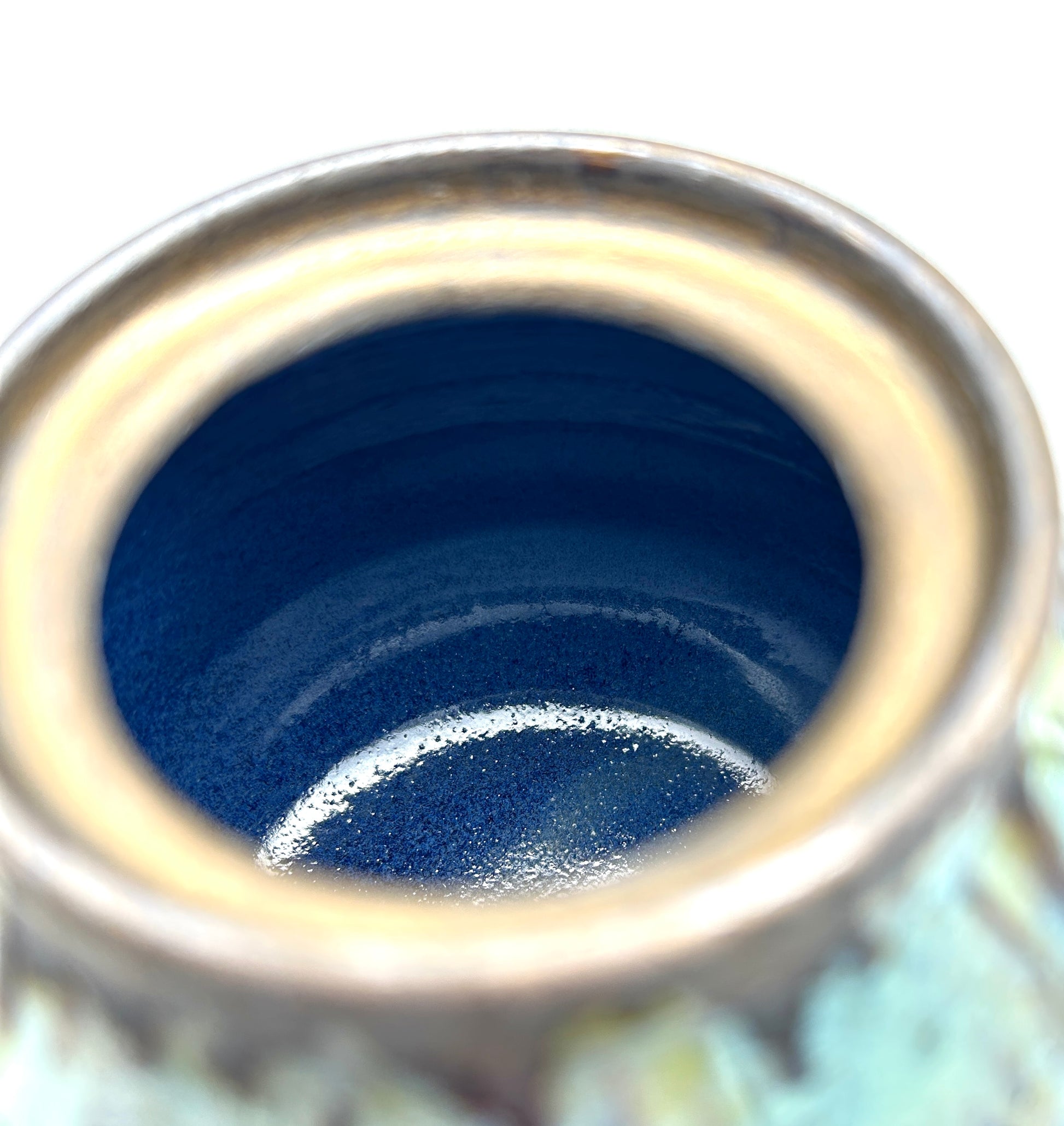 Rich blue inside, the outside has a flowing green glaze with a special tarnished gold effect at the top.